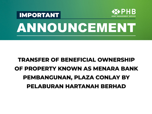 Announcement: Transfer of Beneficial Ownership of Property known as Menara Bank Pembangunan, Plaza Conlay by Pelaburan Hartanah Berhad into Amanah Hartanah Bumiputera.